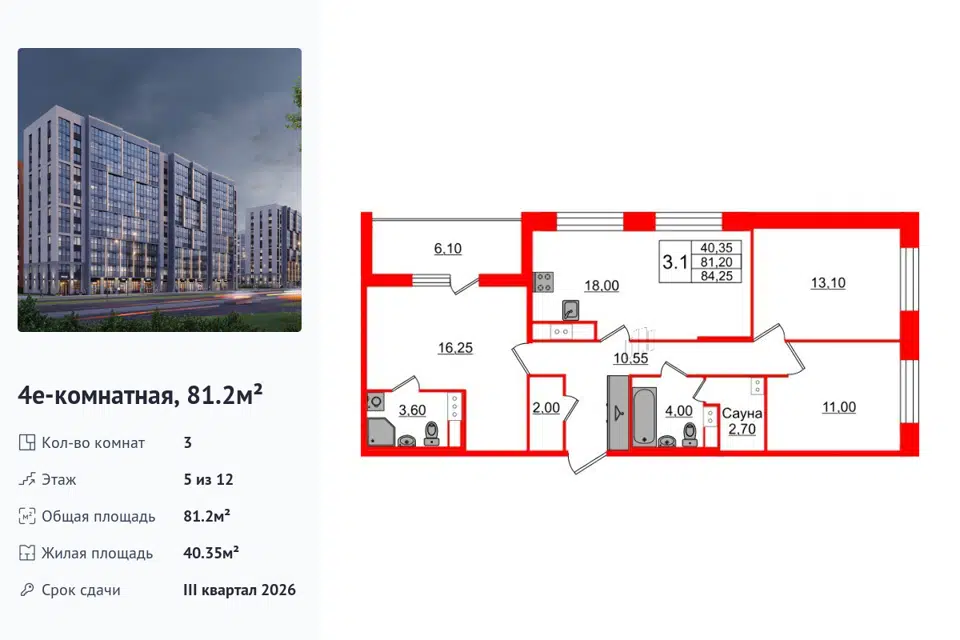 3-комн. кв., 81.2 м², 4/14 этаж