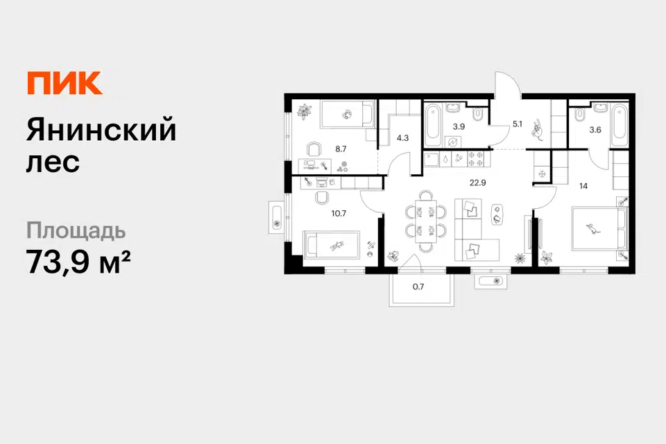 3-комн. кв., 73.9 м², 5/15 этаж