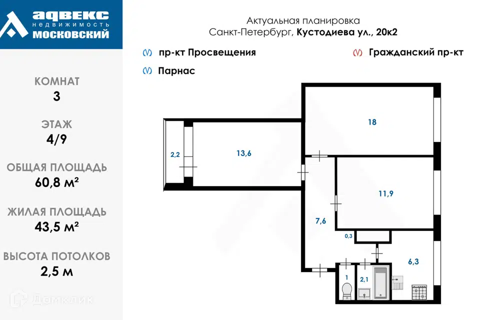 Купить трехкомнатную квартиру в Санкт-Петербурге у метро Проспект Просвещения