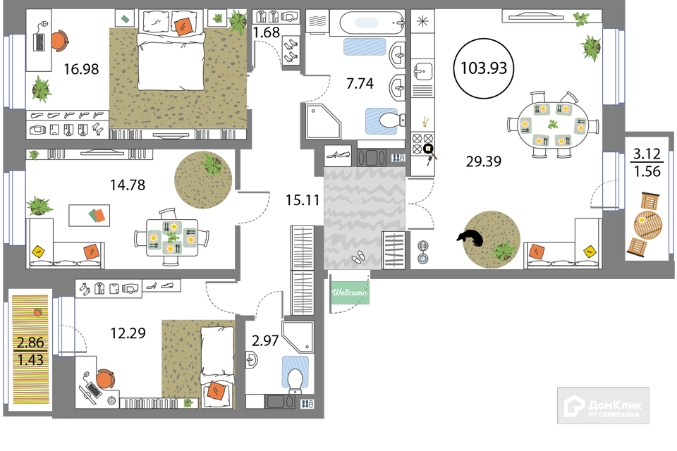 3-комн. кв., 102.4 м², 12/14 этаж