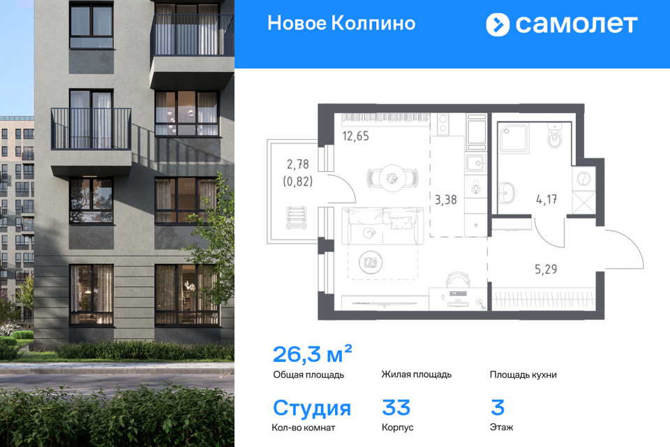 Студия, 26.31 м², 3/11 этаж