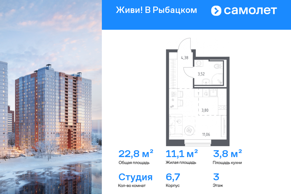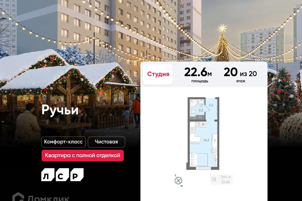 Студия, 22.6 м², 3/20 этаж