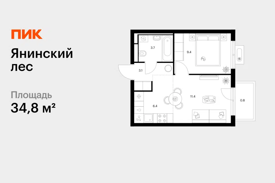 1-комн. кв., 34.8 м², 4/15 этаж