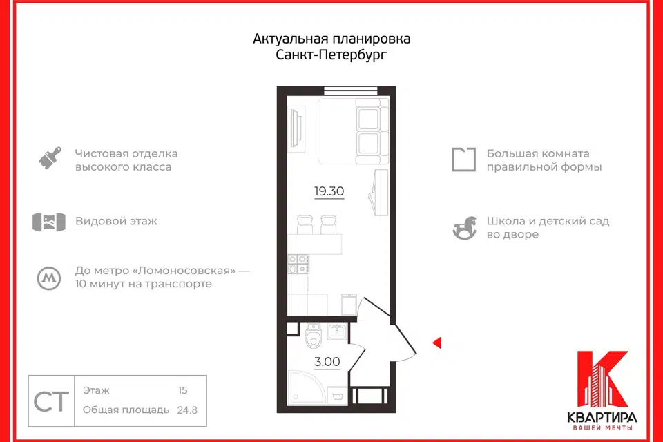Студия, 24.8 м², 15/25 этаж