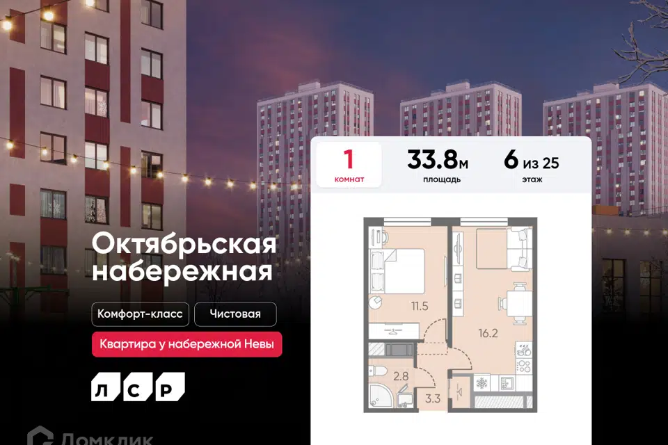1-комн. кв., от 33.5 м², 3-11 этажи
