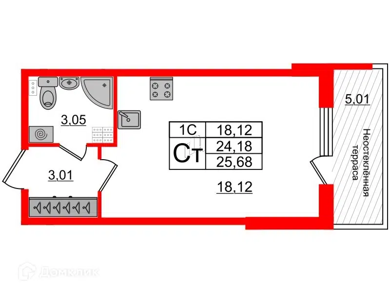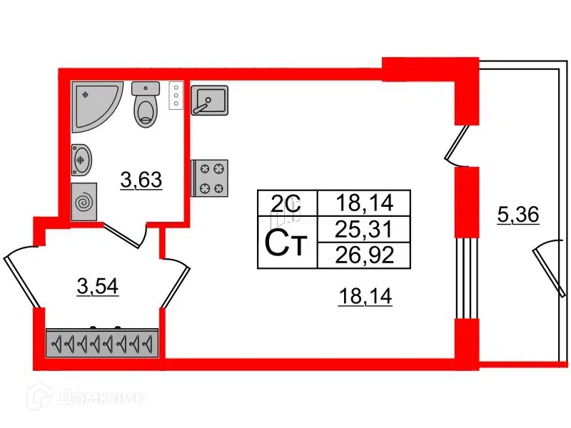 Студия, 25.31 м², 1/1 этаж