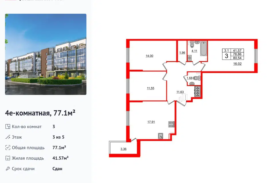3-комн. кв., 77.1 м², 2/1 этаж
