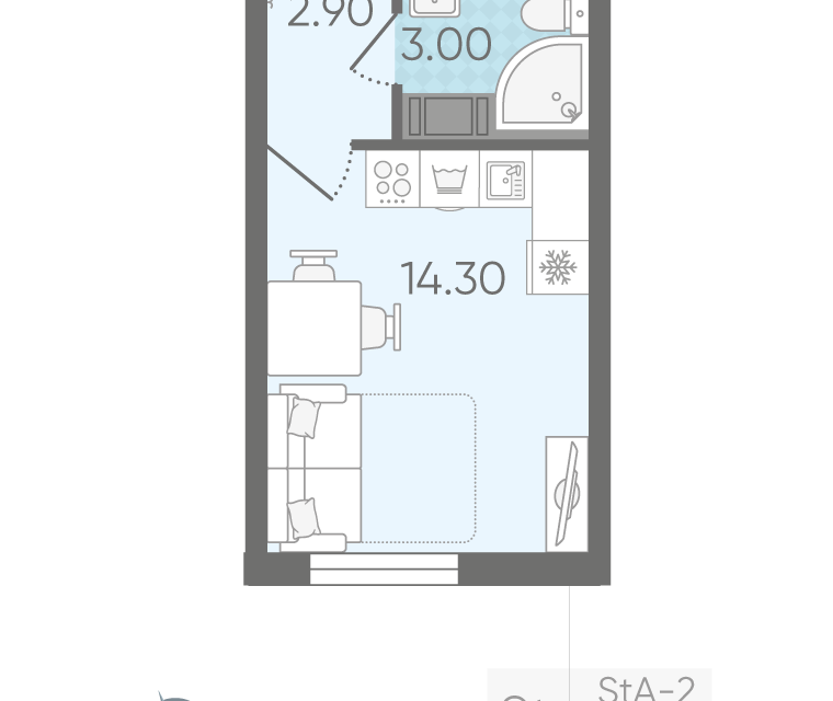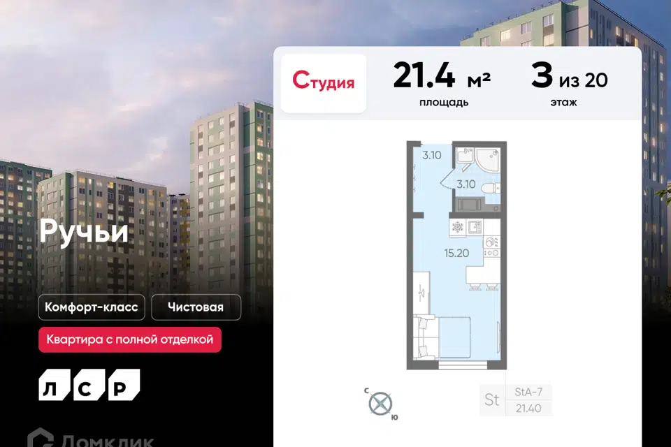 Студия, 21.4 м², 14/22 этаж
