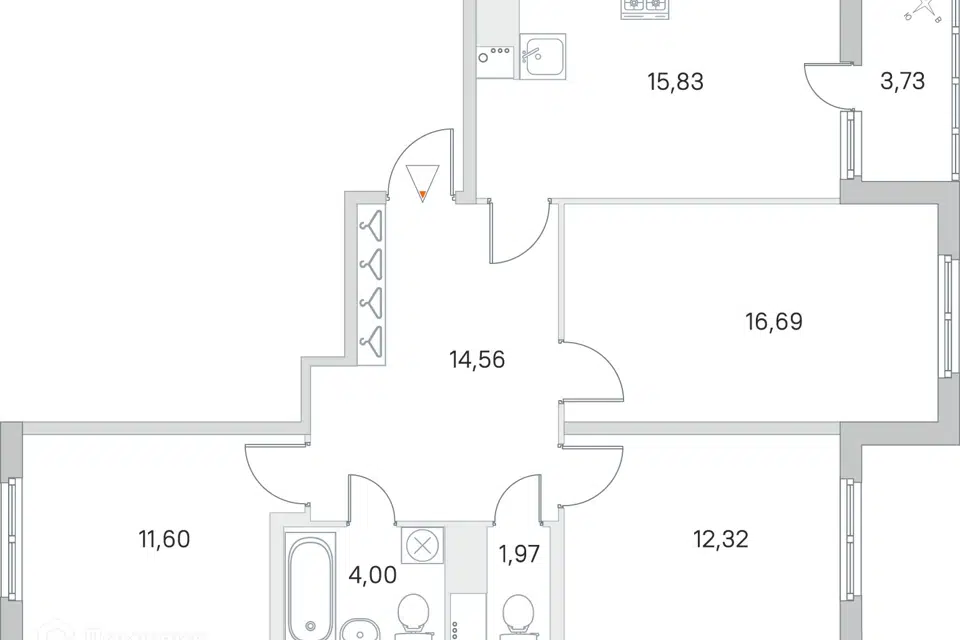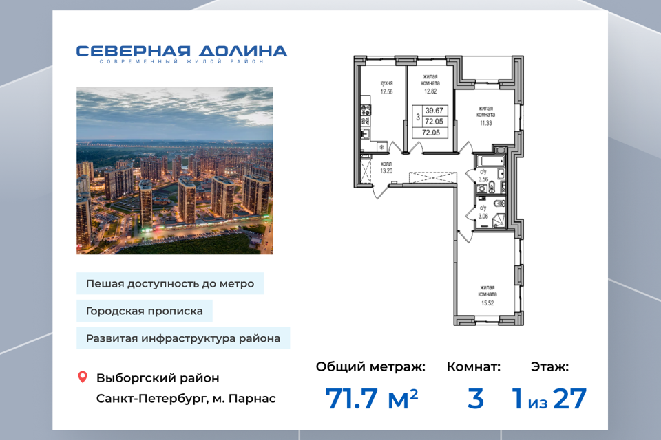 3-комн. кв., 71.7 м², 1/27 этаж