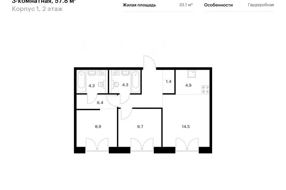 2-комн. кв., 57.8 м², 3/9 этаж