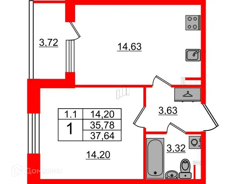 1-комн. кв., 35.78 м², 2/1 этаж