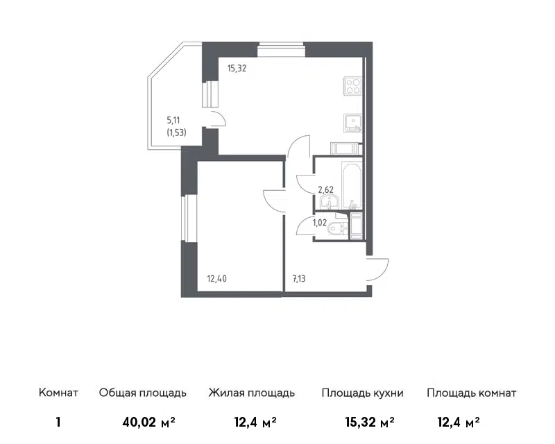 1-комн. кв., 40.1 м², 3/15 этаж