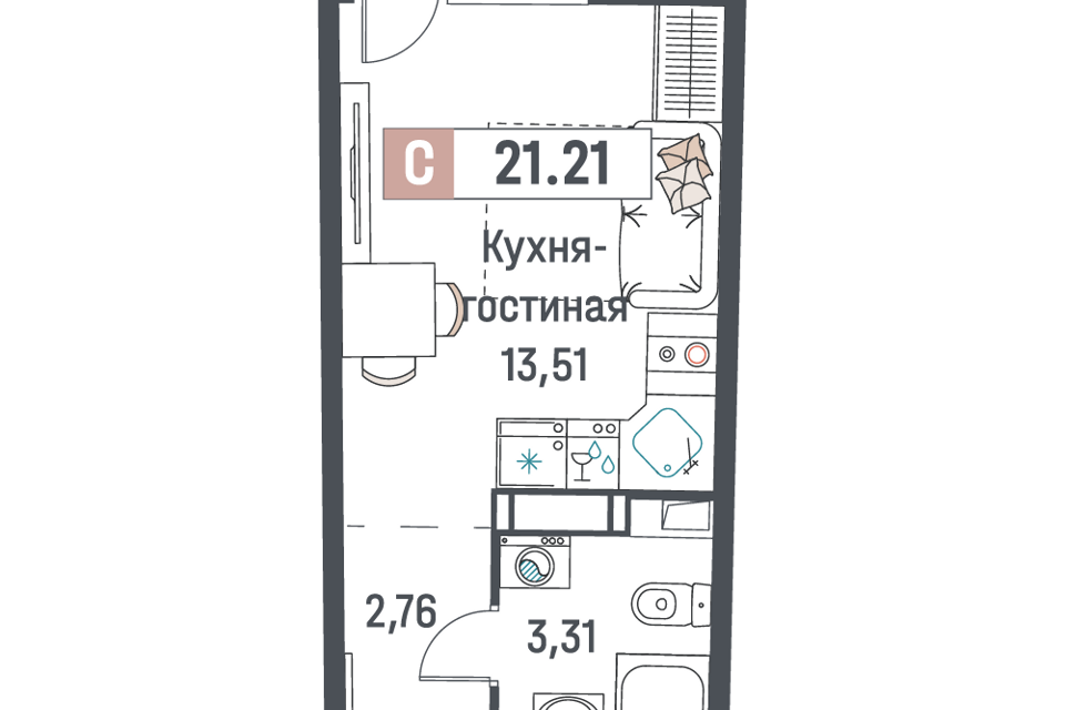 Студия, 21.21 м², 16/18 этаж
