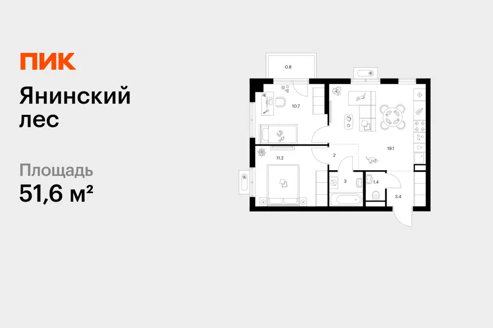 2-комн. кв., 51.6 м², 1/15 этаж