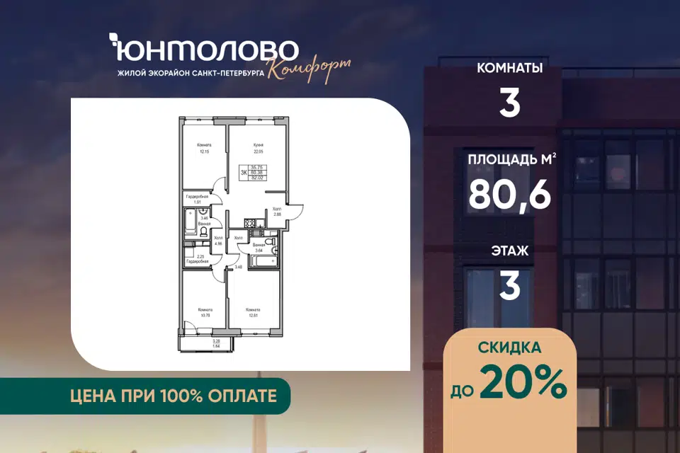 3-комн. кв., 80.6 м², 3/23 этаж