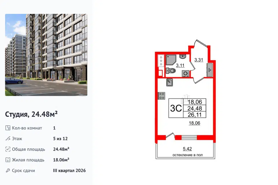 Студия, 24.48 м², 5/1 этаж