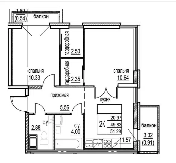 2-комн. кв., 51.28 м², 12/12 этаж