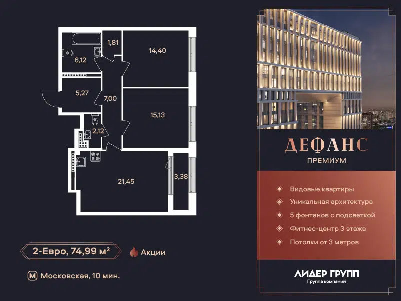 2-комн. кв., 75.2 м², 21/25 этаж