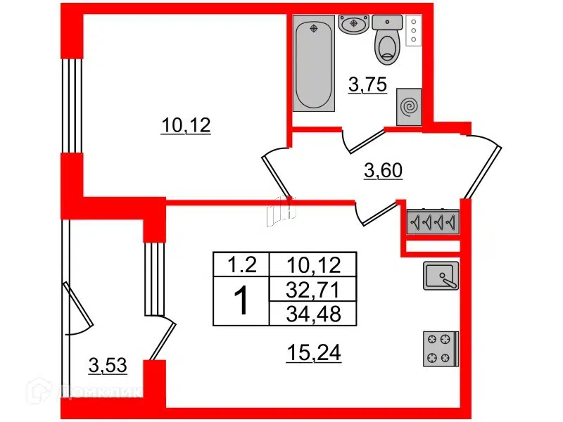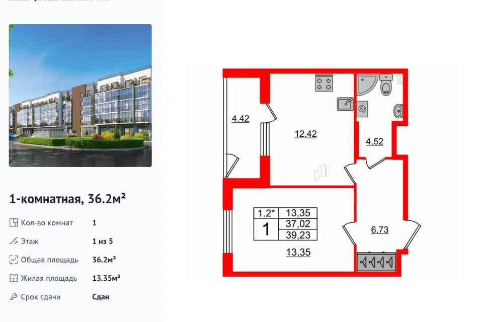 1-комн. кв., от 34.3 м², 3/5 этаж