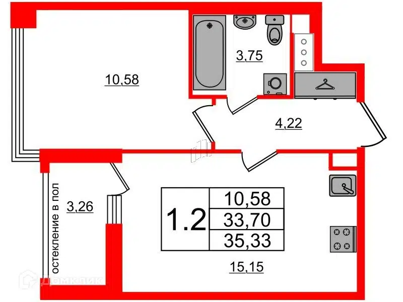 1-комн. кв., 33.7 м², 4/12 этаж
