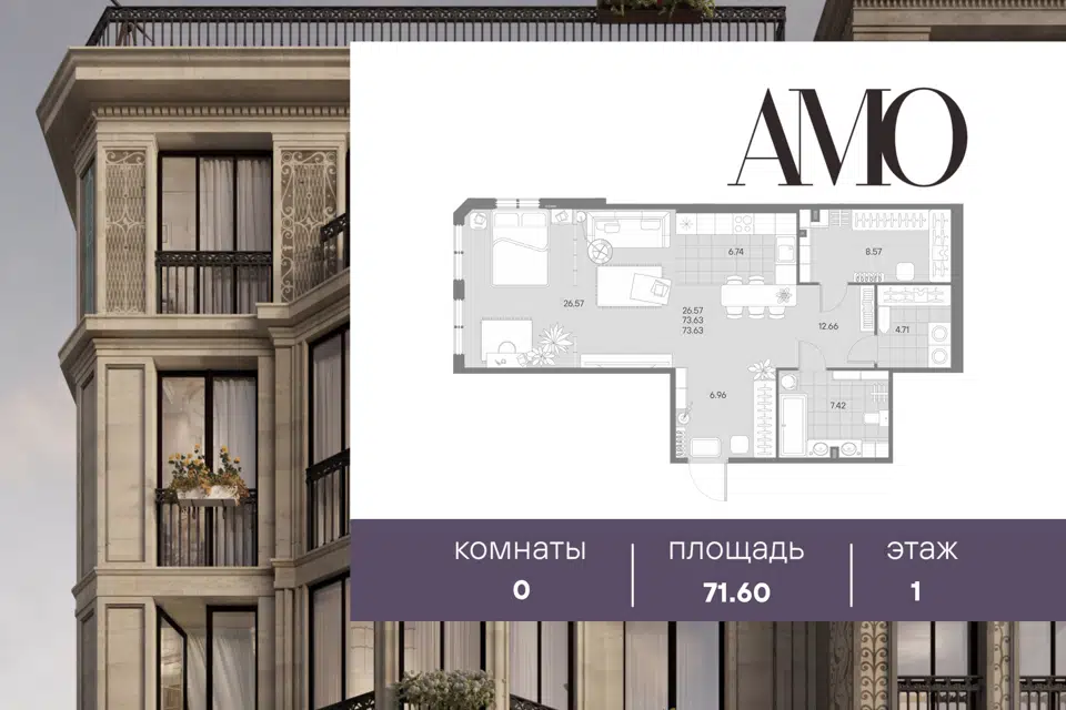 Студия, 71.6 м², 1/7 этаж