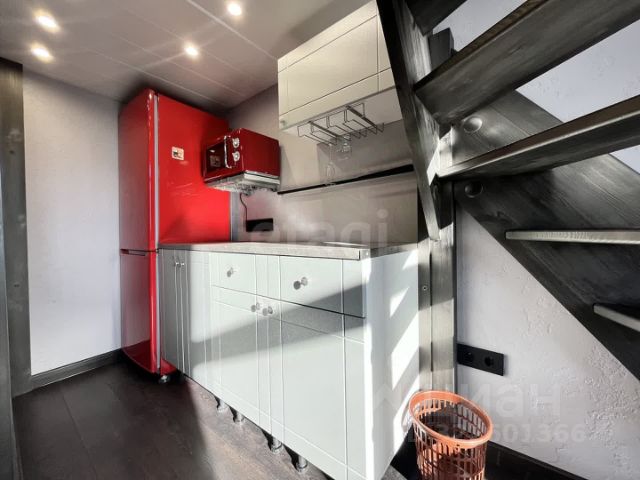 • На первом этаже комната оборудована кухонным гарнитуром с холодильником и микроволновой печью. При желании вы можете приобрести электрическую или индукционную плитку для приготовления пищи.