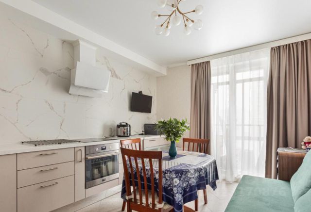 Квартира полностью готова к проживанию. В просторной кухне- гостиной установлен кухонный гарнитур, раздвижной обеденный стол и удобные вращающиеся стулья. Установлен новый холодильник, оптимального размера. Из кухни выход на лоджию, с видом на закрытый двор и детскую площадку.