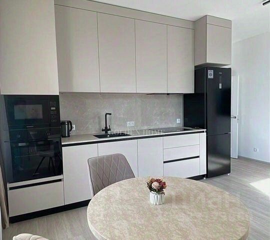 Квартира полностью готова к проживанию. В просторной кухне- гостиной установлен кухонный гарнитур, раздвижной обеденный стол и удобные вращающиеся стулья. Установлен новый холодильник, оптимального размера. Из кухни выход на лоджию, с видом на закрытый двор и детскую площадку.