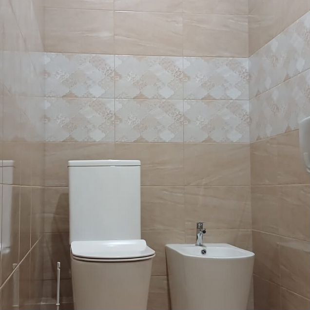 Санузел выложен керамогранитом Kerama Marazzi, инсталляция Grohe, тропический душ, установлена стиральная машина, сделан вывод под водонагреватель, но он не нужен, тк дом имеет индивидуальную систему газового обогрева.