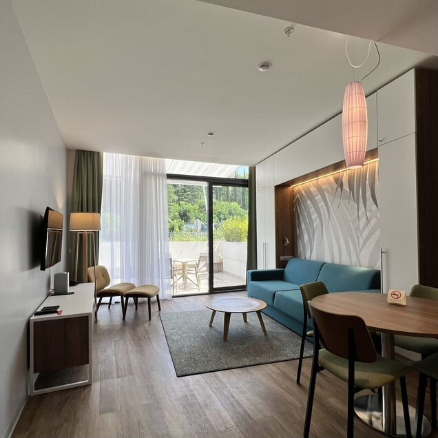 Редлагаем к покупке стильный апартамент в современном отеле 4 Cosmos Stay Le Rond Sochi в микрорайоне Дагомыс. Апартамент площадью 60 м² включает просторную кухню-гостиную, отдельную спальню, совмещённый санузел и открытую террасу с зоной отдыха.