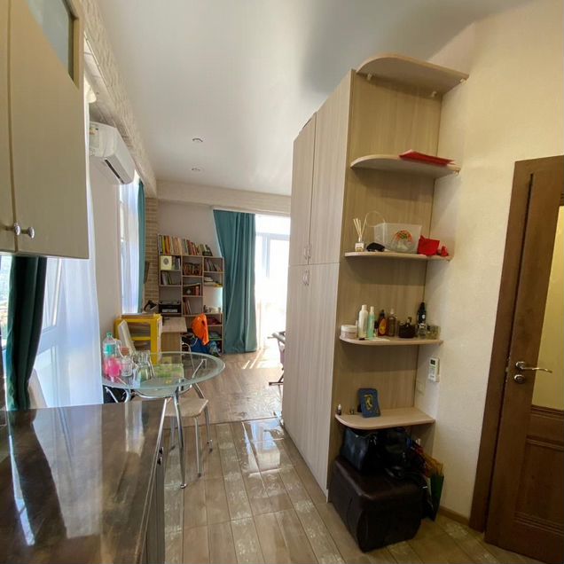 В квартире сделан качественный евроремонт, поэтому можно сразу заезжать и жить. Пространство студии грамотно организовано, а окна выходят как во двор, так и на улицу, что обеспечивает хорошее естественное освещение. В санузле установлена современная сантехника. Площадь кухни составляет 8 кв. м — достаточно места, чтобы готовить с комфортом. Также есть балкон, где можно наслаждаться утренним кофе.