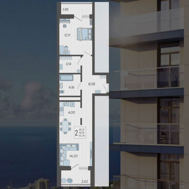 Квартира площадью 50 м², расположенную на 4 этаже современного жилого комплекса «Кислород».