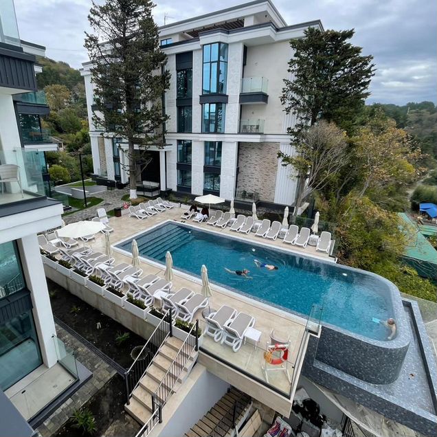 Комплекс #1 на море — 1ая береговая линия, 3 подогреваемых круглогодичных инфинити бассейна, белый камень зданий, песчаный пляж, звук цикад, бесконечное море и свежесть парка.
