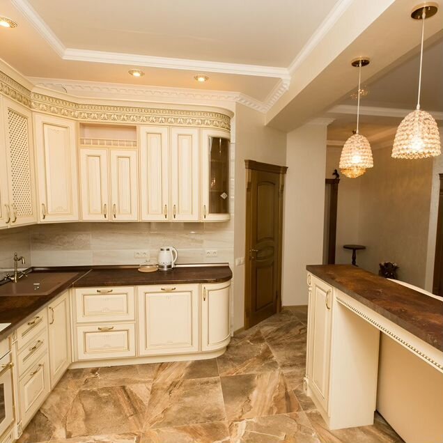 — На кухне — индивидуальный гарнитур «Мария», спроектированный под планировку помещения.