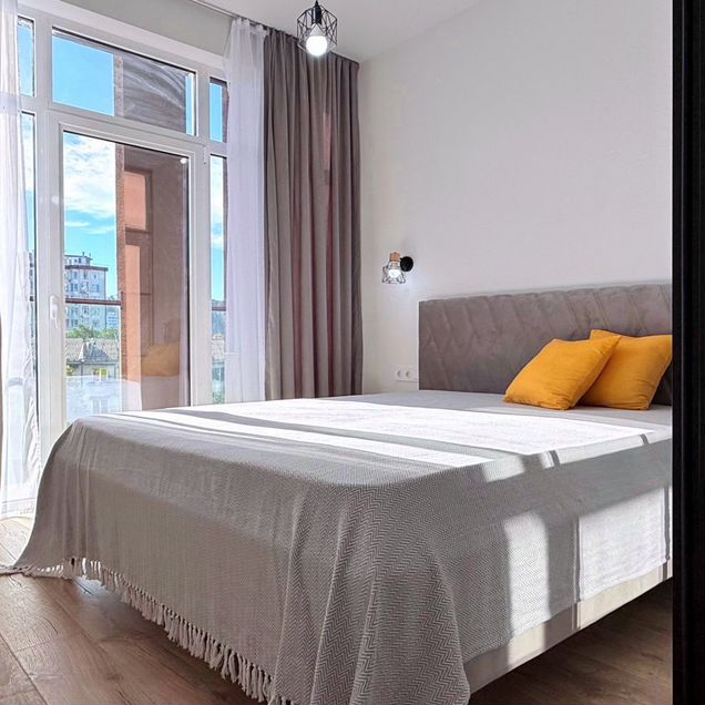 Квартира расположена на 3-м этаже, имеет панорамное окно с выходом на открытый просторный балкон с видом на бассейн. В помещении выполнен косметический ремонт, установлена вся необходимая мебель и техника для комфортного проживания; апартаменты также укомплектованы посудой и текстилем.