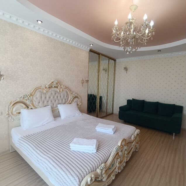 Отдельная большая спальня с двуспальной кроватью и раздвижным диваном и кухня гостинная с раздвижным двуспальным диваном, вмещает до 6-ти человек. Есть детский стульчик для кормления.