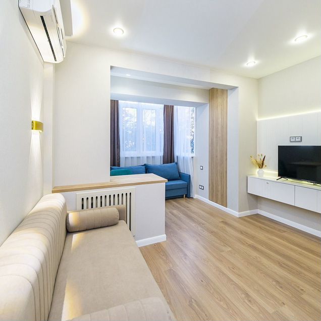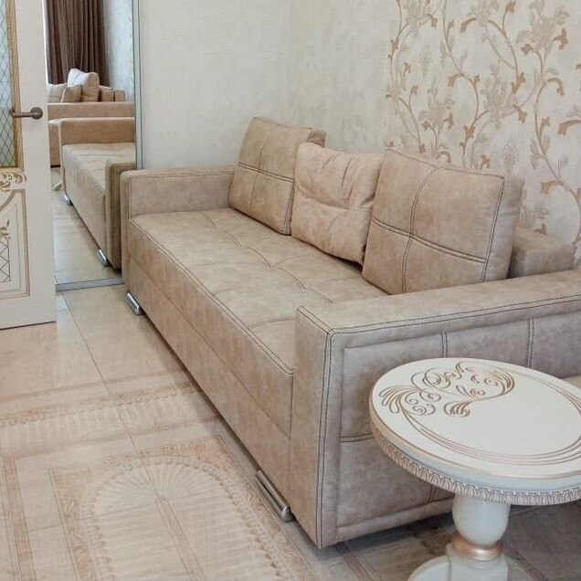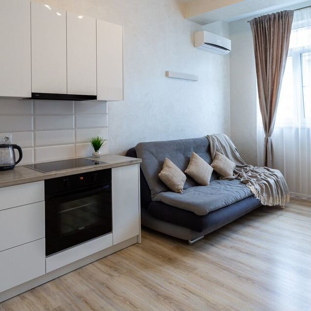 — Удобный раскладной диван в кухне-гостиной — идеальное место для отдыха.