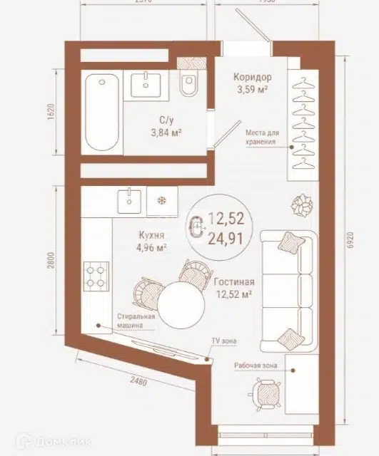 Студия, 24.91 м², 18/25 этаж