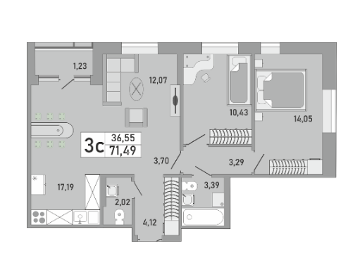 3-комн. кв., 71.49 м², 11/25 этаж