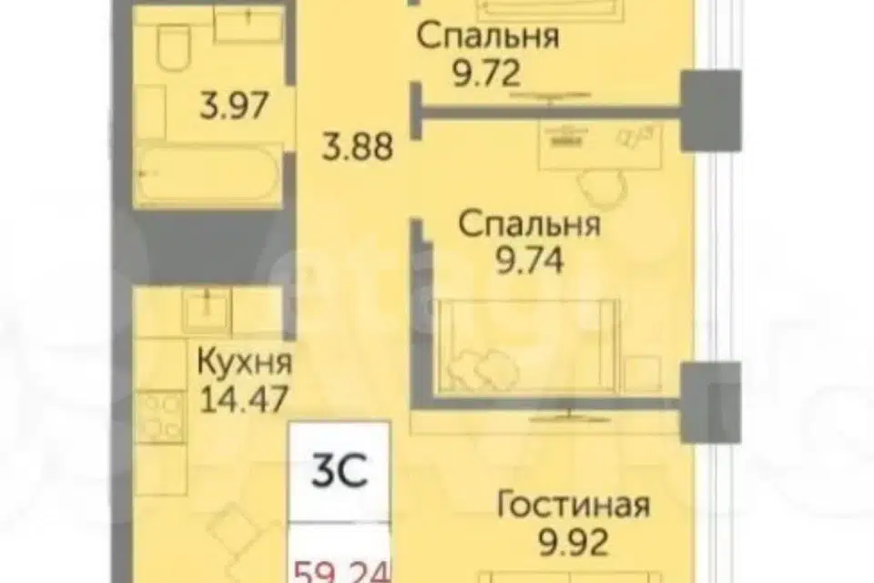 3-комн. кв., 57.5 м², 4/9 этаж