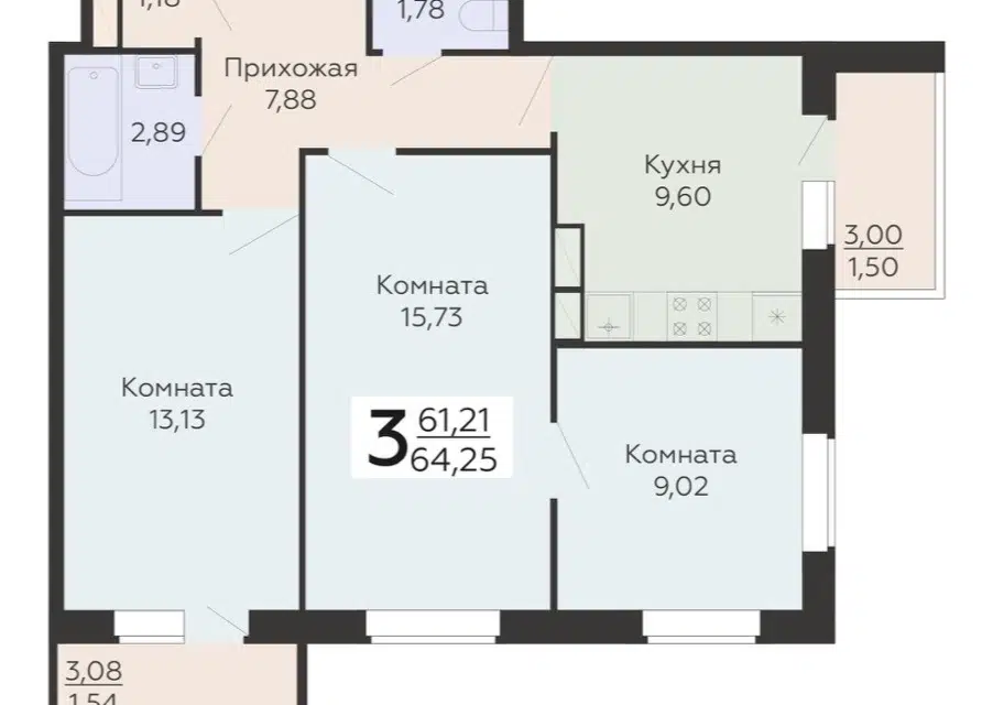 3-комн. кв., 64.25 м², 6/10 этаж