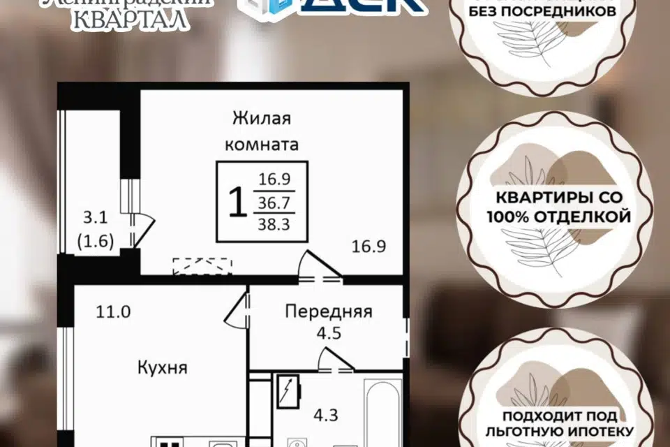 1-комн. кв., 39.2 м², 16/17 этаж