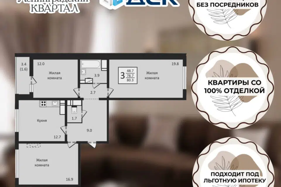 3-комн. кв., 80.5 м², 4/15 этаж
