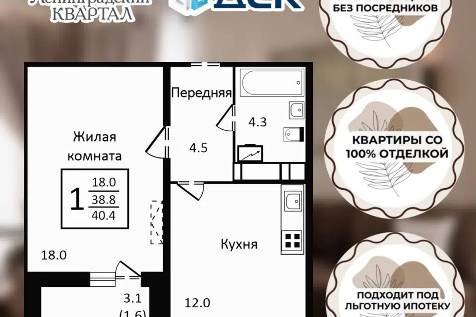 1-комн. кв., 40.5 м², 9/15 этаж