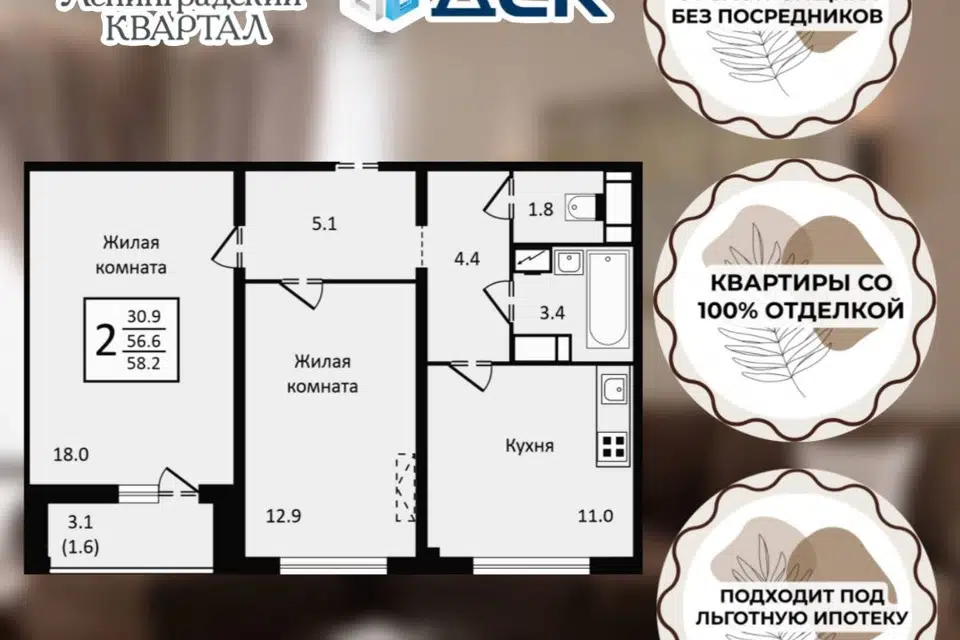 2-комн. кв., 59.8 м², 9/10 этаж