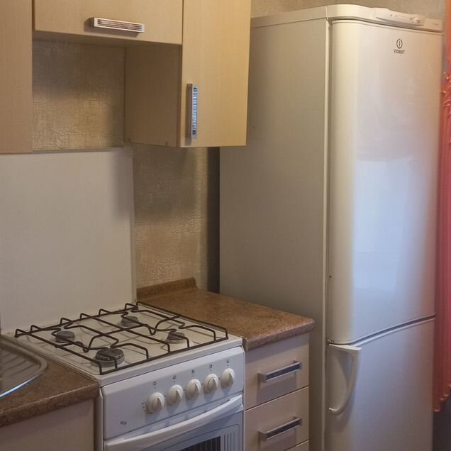 Квартира укомплектована полностью мебелью и бытовой техникой (кухонный гарнитур, электрическая плита, холодильник, стол, 2 стула, диван двуспальный, стиральная машина, шкаф для одежды и белья). Два спальных места.